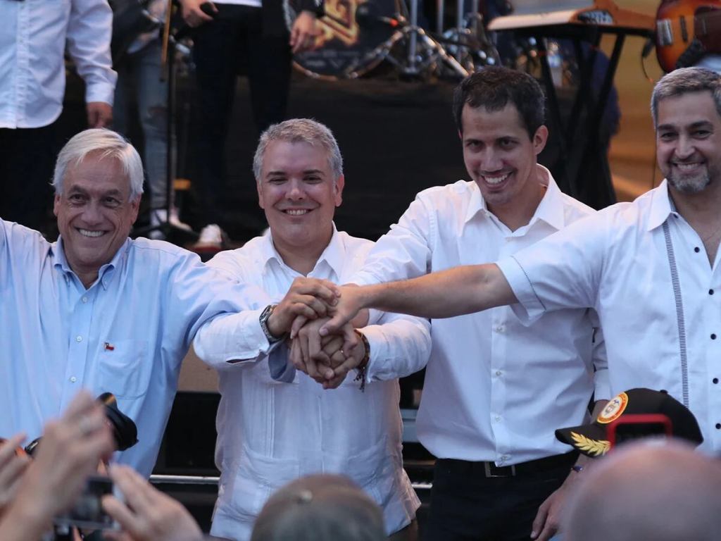 Pues es ahí donde Duque con la facilidad de que idiota atrae a más idiotas, conformó lo que se autodenominaría cerco diplomático para derrocar a Maduro, así que se unieron en bloque, el entonces presidente de Chile, Sebastián Piñera, el presidente de Paraguay, Mario Abdo Benítez, el presidente interino de Venezuela, Juan Guaidó, y el presidente de Colombia, como anfitrión de este evento, se fijó para el 23 de febrero de 2019, la entrega de las ayudas humanitarias que Guaidó había logrado acumular, con el apoyo de la OEA y la venia del presidente de Colombia, cabe notar que para la entrega de estas ayudas, no se vinculó la Cruz Roja Internacional, ni la Iglesia Católica, pues era evidente el tinte político de este evento humanitario, la misma Organización de las Naciones Unidas, negó el apoyo a dicho evento, pues alegó que quien debía pedir dichas ayudas, debió ser el Gobierno Venezolano, así ya estaba la fecha y hora para derrocar a Maduro y que produjera que Duque saliera triunfante y que quedara en la historia de principios de siglo 21, como el segundo libertador de Venezuela y el ícono de la igualdad en el mundo, gobernando un país con infinidad de problemas.