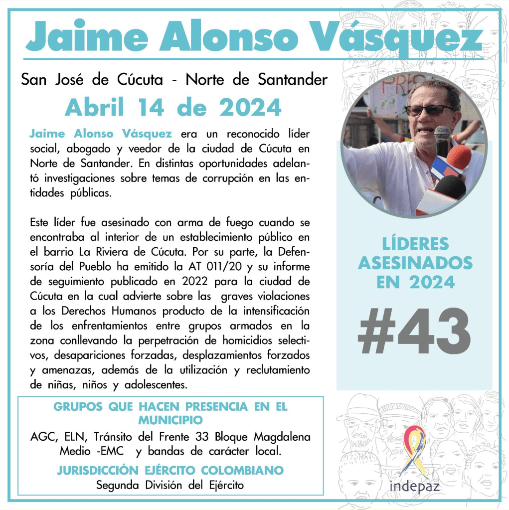 No es con el anuncio de cincuenta millones de pesos, que ofrece la gobernación del departamento, a quien de información que permita la captura de quienes no solo mataron a Jaime Vásquez, sino que enlutaron al mundo de los defensores de la verdad y la moral pública, la detención de los gatilleros no basta ni es la respuesta que Colombia y el mundo espera, urge una profunda investigación para llegar hasta los determinadores intelectuales de quienes ordenaron las muertes de Koki Solano y Jaime Vásquez, por la memoria de los 43 lideres(as) sociales que cuantificamos en tan solo 4 meses del año 2024.