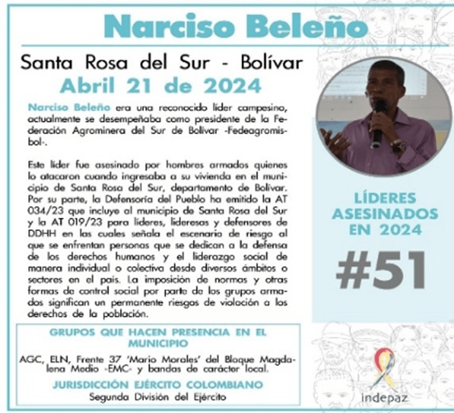El cobarde asesinato del que fue víctima el respetado líder social, Narciso Beleño en el municipio de Santa Rosa Sur de Bolívar; deja en evidencia el grave riesgo que significa ser líder social en Colombia. No solo por la acción homicida de los grupos armados en asocio con los clanes políticos y mafiosos regionales; si no por la inacción del Estado y su incompetencia a la hora de proteger la vida de los miembros de una población que viene siendo víctima de un exterminio. Donde escribir sobre lo que está pasando nos convierte en un blanco legítimo, de los cobardes homicidas, quienes ven en la muerte su único argumento.