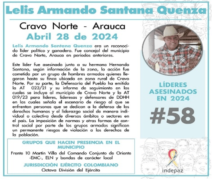 A comienzos del mes de abril de 2024 se pudo conocer a través de un comunicado emitido por las disidencias de las FARC, quienes asumen la responsabilidad sobre las muertes de dos lideres sociales en Tame Arauca. Los que sindicaron de que hacían parte al ELN. Seguido a ello lanzan una amenaza sobre las personas que desempeñan liderazgo y que son señaladas por las disidencias de estar al servicio del ELN, lo que evidencia el grave riesgo que corren los lideres y lideresas sociales, Defensores de los Derechos Humanos en las áreas de conflicto.