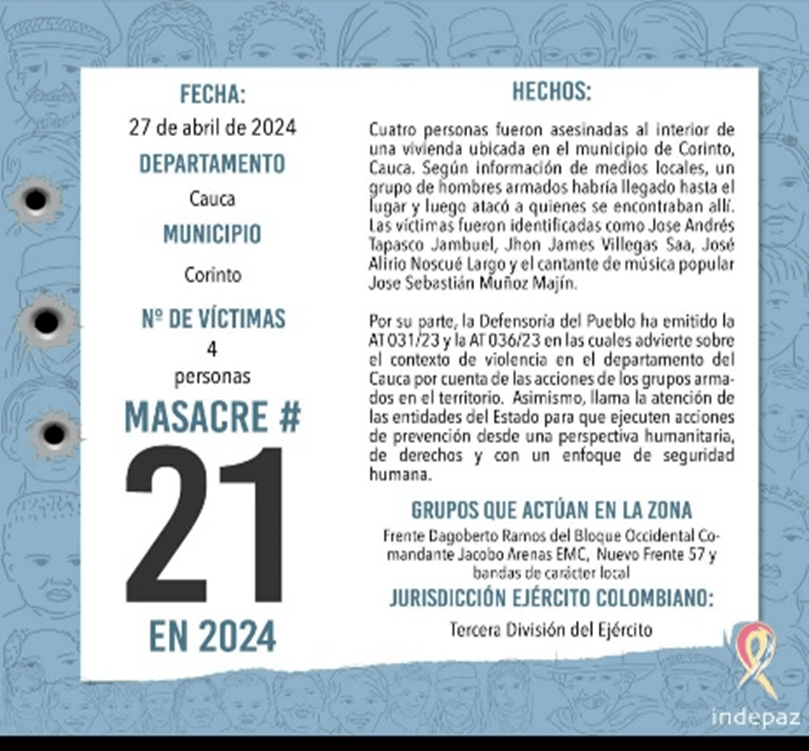 Solo en la tercera semana del mes de abril de 2024, de acuerdo a los registros del Instituto de Estudios para el Desarrollo y la Paz (INDEPAZ), 8 lideres sociales fueron asesinados en tan solo una semana. Engrosando la penosa cifra de 58 Lideres(as) Sociales, en los primeros cuatro meses del año 2024 y veintiún masacres. Crímenes de los cuales se conoce muy poco sobre el estado actual de los procesos que permitan la identificación de los determinadores intelectuales de esas muertes.